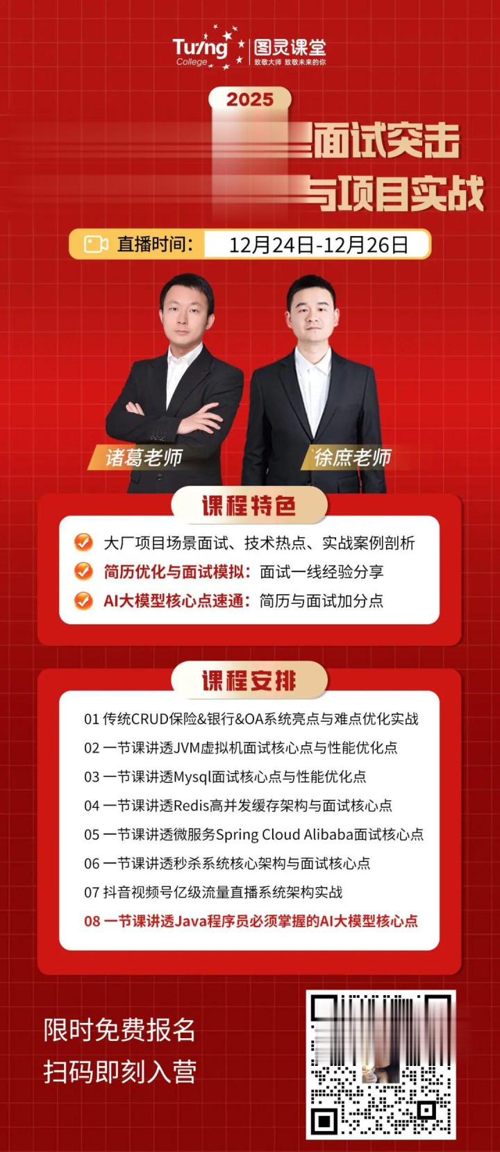 针对想要更快了解口试重心和系统学习技巧的一又友,这里也给人人保举一个免费技巧课程—— 《Java+AI大模子口试晋升测验营 》。课程直播时候是12月24日-12月26日,3天课程,每晚8点,未必候的热烈暴戾学习一下,本课程由图灵课堂的两位大佬共同主讲,通过着及时势案例的分析和演练,让你在口试中不仅粗心恢复问题,还粗心展示我方的念念维方式和技巧深度。